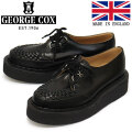 ジョージコックス社は、1906年、創業者ジョージ・ジェイムス・コックスによってイギリスノーザンプトンに設立されました。ノーザンプトンは、イギリス靴産業の中心地で、ジョージコックス社も又、この地で高い評価を受け、その後1949年、長男であったジョージ・ハミルトン・コックスが、創業者の意志をを継ぎ、社長に就任します。1949年は、同時にブローセルクリーパーズ(ラバーソール)の誕生の都市でもあります。このブローセルクリーパーズと呼ばれる、ゴム厚底(ラバーソール)の靴は大ヒット商品となり、1960年代には、イギリスのロック好きな若者達の必須アイテムとなっていました。1972年に入ると、ビビアンウエストウッドとマルコムマクラーレン(後のセックスピストルズのマネージャー)が彼らの最初のテディボーイ向けショップとして、”レットイットロック”を、キングスロード430番地にオープンさせ、ジョージコックス社製のラバーソールの販売を始めます。1976年には、店の名前は”セックス”に変わっていましたが、パンクの時代を背景に、セックスピストルズやクラッシュを始めとするパンクバンドのメンバーに着用され、カルト的なステイタスを獲得したジョージコックス社製のクリーパーズは、ストレイキャッツのデビューを皮切りに80年代初めのロカビリーブームの時でさえも若者に熱く支持されつづけました。ジョージコックス社では、1973年~1995年の間、ドクターマーチンソールを使用したモデルを生産するなど常に時代の最先端を先取りし、個性的な靴を作り続けていながら、尚且つ靴作りの基本を見失わない。又、決して、大量生産を望まないと云う企業姿勢を守り続けています。創業より100年を迎えた今日に於いても尚、個性やオリジナリティを大切にしようとする若者に、支持され続けている理由がそこにあるのです。この精神は、3代目社長であるノーマン・ウォーターフィールドから、4代目のアダム・ウォーターフィールドへと、現代に至るまで脈々と引き継がれているのです。そしてこの精神が靴に込められているからこそ、ジョージコック社製の靴が、その時代の若者の心を魅了して止まないのです。