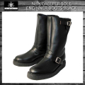 No.5 Creeper Sole Engineer Boots ナンバーファイブクリーパーソールエンジニアブーツ 90年代にヴィヴィアンウエストウッドのコレクションで起用された、ジョージコックス社製エンジニアブーツのアッパーに、分厚いリップルソールと、ゴールドのデザインバックルをあしらったものが日本でも高い人気を誇っていた。それと同じアッパー(バックルはシンプルなシルバーのものを使用)のブーツに独自のNO.5コルゲートクリーパーソールを付けた別注品。 バックルの形状が若干異なるアイテムもございます。ご了承ください。 |