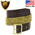 ダークブラウンの分厚いレザーにアンティック加工されたゴールドスタッズが5連に手打ちされた豪快で迫力があり、スタッズベルトの王道ともいえるデザインです。