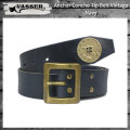 | "Anchor Concho Tip Belt" 古着屋の隅でひと際輝きを放つカラフルなアメリカンビンテージベルトをモチーフとした VASSERのオールハンドメイドによる肉厚のオイルドレザーを使用したベルト。 得意とする金属部はもちろん、レザー部にまで全て手作業によるビンテージ加工を施し、アメリカならではの武骨さとハンドメイドインジャパンによる繊細さとを織り交ぜた非常に手の込んだ作品。 ※天然革による皺・筋等本来のアジをそのまま活かし、ハンドメイドによる独自技法のヴィンテージ加工を行っている為、それぞれ風合いの個体差がございます。 素材:牛革・ブラス ベルト幅:約40mm ベルト厚:約4mm ベルト穴の間隔:25mm ベルトサイズ 32インチ:全長約97cm,サイズ間約77~87cm 34インチ:全長約102cm,サイズ間約82~92cm 36インチ:全長約107cm,サイズ間約87~97cm ※サイズ間隔はベルトのバックルの先から穴までの実寸値です。現在お使いのベルト実寸を計測のうえサイズをお選びください。またハンドメイドの製品のため多少の個体差も御座います。 ベルトの先端に13Star Anchorデザインのブラス製コンチョ型スタッズが装着されたタイプ。 取って付けた風合いではなく、そのモノ自体の内側からビンテージの香りが 漂うまで 惜し気もなく徹底的に手作業で加工しています。 重厚なスクエア型ブラスバックルを標準装備。ブラスパーツ全てにビンテージ加工。 手裁ちによる剣先にブラス製コンチョ型スタッズのアクセント。 ティアドロップ型のベルト穴が2.5cm間隔に5穴。 引っかかる隙間が出来ぬ様オリジナルで作成したコンチョは爪留め式のスタッズ仕様 ビンテージ仕上げと言えど裏面やコバの毛羽立ち処理を施した上での決して手の抜かない仕上げ。 芯を残した染色でコバの2トーンがレトロな雰囲気を演出します。 折り返し部にVASSER刻印。 アメリカより取り寄せたビンテージタイプのクローバー型スナップを贅沢に4点留めでバックル交換可能。 ※入荷時期により内側金具がニッケルのものもございます。 むやみやたらに加工しすぎず、オイルドレザーのハリを残した仕上がりです。 |
