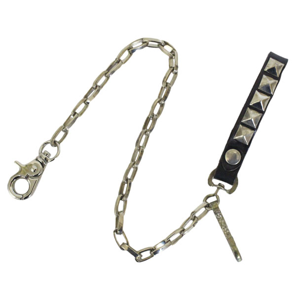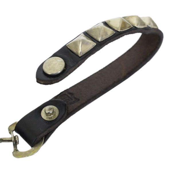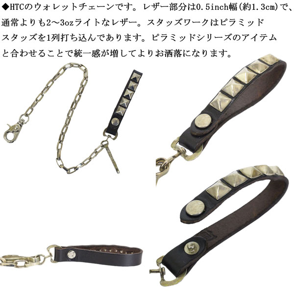 HTCのウォレットチェーンです。レザー部分は0.5inch幅(約1.3cm)で、通常よりも2~3ozライトなレザー。スタッズワークはピラミッドスタッズを1列打ち込んであります。