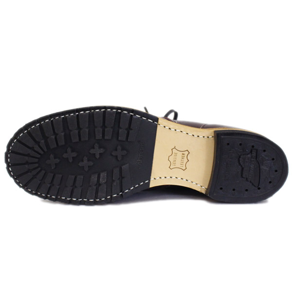 レッド・ウィング社のラウンドトゥのワークブーツに広く使われている「8番」ラスト(木型)を使用したオーソドックスなスタイルと、品のある艶を持つレザー。伝統的なレザーソールにグリップの良い樹脂製の半張りを取り付け、実用性を加えたソール。こうした要素の組み合わせが、フォーマルなスタイルに実用性を加味した伝統的なアメリカのブーツを思わせます。